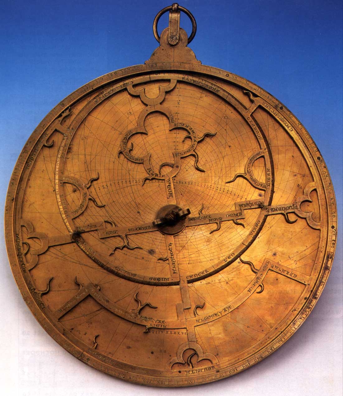 Gleiches Prinzip wie die Sternkarte. Das durchbrochene "Gitter" vorne zeigt auf markante Sterne. Die Grundplatte ist mit Linien zur Bestimmung von Azimut und Höhe versehen und kann je nach geografischer Breite ausgewechselt werden. Während die Sternkarte dem Auffinden der Sterne dient, diente das Astrolabium "umgekehrt" in erster Linie der Zeitmessung.